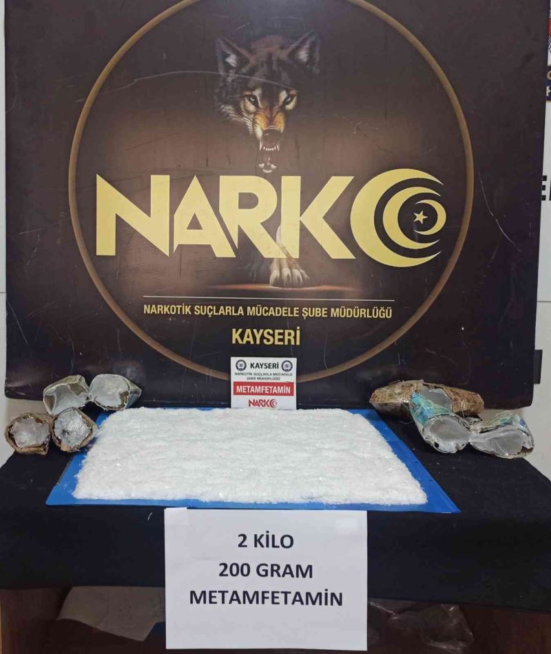 Kayseri’de polis ekipleri tarafından yapılan operasyonda 2 kilo 200 gram metamfetamin ele geçirildi.
