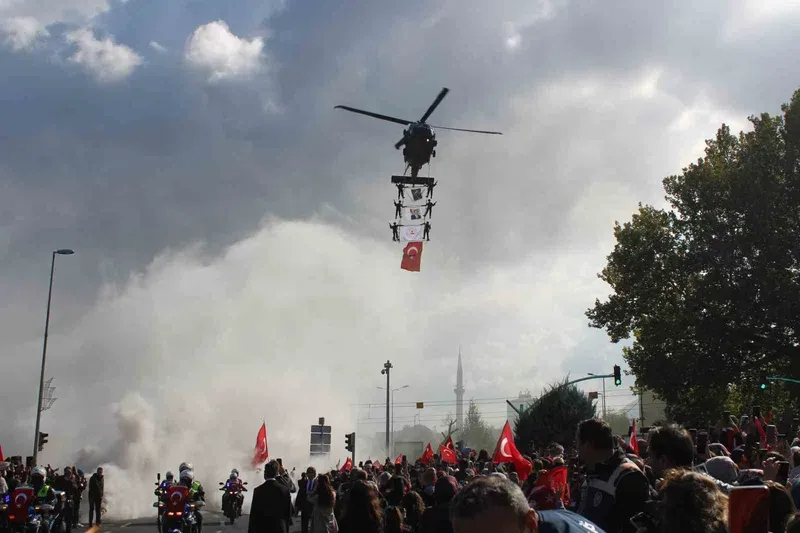 Öte yandan konuşmaların ardından düzenlenen kortejde ise Jandarma Genel Komutanlığı’na bağlı ‘Çelik Kanatlar’ ekibi tarafından vatandaşlara üzüm salkımı gösterisi yapıldı. Gösteride, askerler helikopterden halatlar ile sarkarak halkın üzerinden uçuş yaptı.
