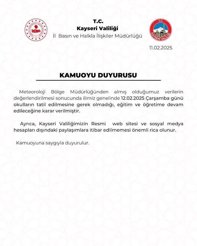 "Meteoroloji Bölge Müdürlüğünden almış olduğumuz verilerin değerlendirilmesi sonucunda ilimiz genelinde 12.02.2025 Çarşamba günü okulların tatil edilmesine gerek olmadığı, eğitim ve öğretime devam edileceğine karar verilmiştir. Ayrıca, Kayseri Valiliğimizin resmi web sitesi ve sosyal medya hesapları dışındaki paylaşımlara itibar edilmemesi önemli rica olunur. Kamuoyuna saygıyla duyurulur."