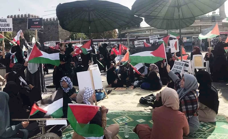Filistin’de yaşanan insanlık dramını protesto etmek için Kayseri Cumhuriyet Meydanı’nda kadınlar tarafından oturma eylemi başlatıldı.