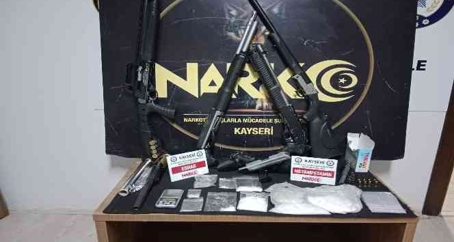 Edinilen bilgiye göre, Kayseri İl Emniyet Müdürlüğü Narkotik Suçlarla Mücadele Şube Müdürlüğü ekipleri, F.A., T.K. ve R.A.’nın birlikte hareket ederek Yeni Sanayi Sitesi içerisinde faaliyet gösteren iş yerinde uyuşturucu madde ticareti yaptığı bilgisine ulaştı. İş yerini tespit eden ekipler, operasyon düzenledi. Yapılan aramada, avizenin ve ilaç kutusunun içerisinde uyuşturucu madde ele geçirilirken, duvarda asılı tablonun arkasında gizlenmiş hassas terazi, 13 adet uyuşturucu paketlemek için kilitli poşet, 1 adet rulo folyo, 4 adet ruhsatsız tabanca ve 4 adet ruhsatsız tüfek ele geçirildi.