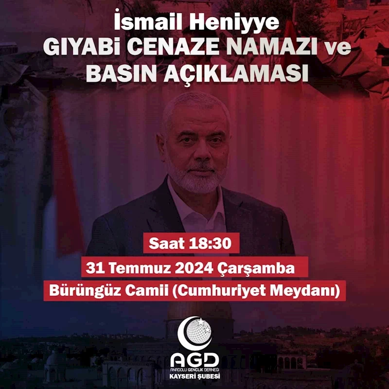 Anadolu Gençlik Derneği Kayseri Şubesi tarafından, bu akşam Bürüngüz Camii’nde Hamas’ın şehit lideri İsmail Heniye için gıyabi cenaze namazı ve basın açıklaması düzenlenecek.