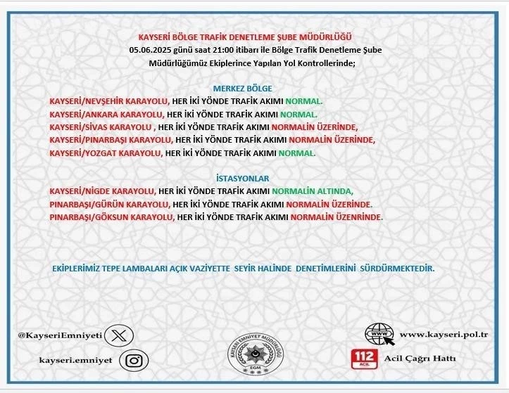 Kayseri Bölge Trafik Denetleme Şube Müdürlüğü tarafından yapılan denetimlerde, trafik akımı Kayseri-Nevşehir yolunda her iki yönde normal, Kayseri-Ankara yolunda her iki yönde normal, Kayseri-Sivas yolu her iki yönde normalin üzerinde, Kayseri-Pınarbaşı yolu her iki yönde normalin üzerinde, Kayseri-Yozgat yolunda her iki yönde normal olarak bildirildi.