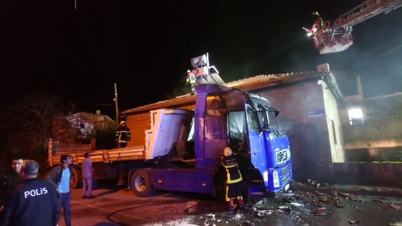 İhbar üzerine bölgeye polis ve itfaiye ekipleri sevk edildi. Polis ekipleri çevrede güvenlik önlemi alırken, tır ve evin çatısındaki yangın itfaiye ekiplerinin müdahalesiyle kısa sürede söndürüldü.