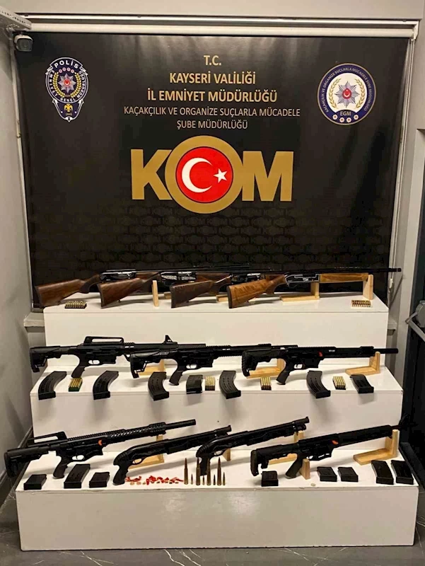 Kayseri İl Emniyet Müdürlüğü Kaçakçılık ve Organize Suçlarla Mücadele Şube Müdürlüğü Organize Suçlar Büro Amirliği ve Mali Suçlar Büro Amirliği ekipleri, ruhsatsız tüfeklerin kente getirilerek yasa dışı yollarla satıldığı bilgisi üzerine harekete geçti. Operasyon düzenleyen ekipler şüpheli 3 kişiyi gözaltına alarak, adreslerinde arama yaptı. Yapılan aramalarda 11 adet ruhsatsız av tüfeği, 4 adet uçaksavar fişeği, 4 adet uzun namlulu tüfek fişeği, 300 adet tabanca fişeği, 15 adet av tüfeklerine ait şarjör, 6 adet sahte çeyrek altın ve 2 adet sahte yarım altın ele geçirildi. Gözaltına alınan 3 kişinin emniyetteki işlemleri sürüyor.