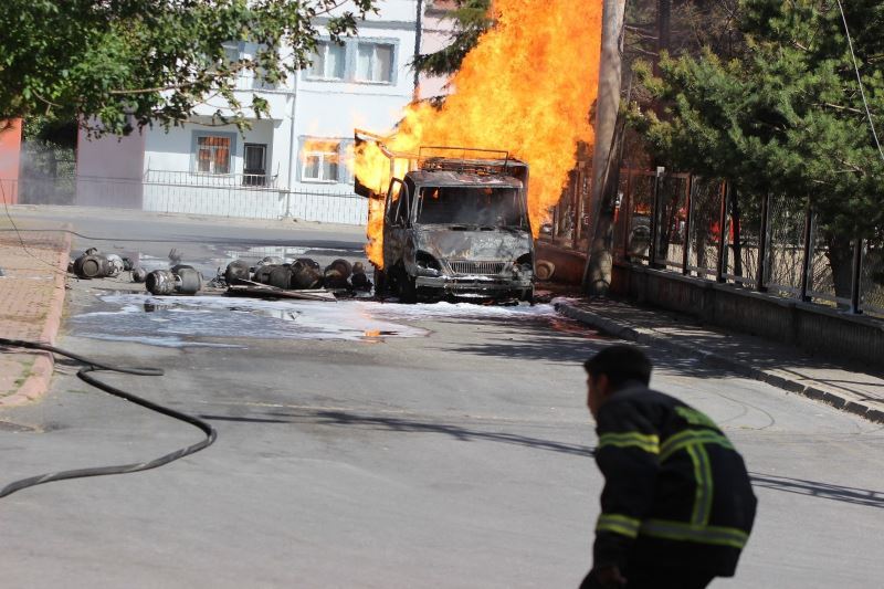 Kayseri’nin Melikgazi ilçesinde tüp taşıyan kamyonet, cayır cayır yandı. Ortaya çıkan görüntüler savaş filmlerinin sahnelerini aratmazken, meraklı vatandaşlar patlayan tüplere aldırış etmeden yangını izledi.