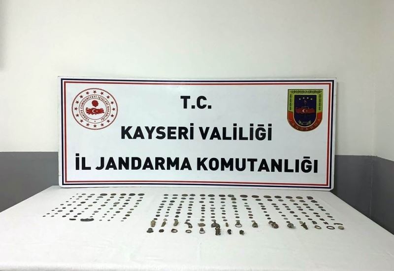 Kayseri İl Jandarma Komutanlığı ekiplerince yapılan çalışmalarda tarihi 235 adet tarihi eser ele geçirilirken olayla ilgili 3 kişi gözaltına alındı.