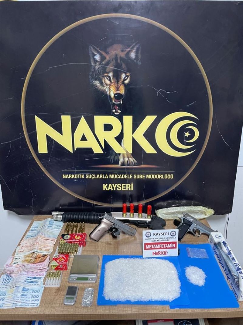 Edinilen bilgiye göre, Narkotik Suçlarla Mücadele Şube Müdürlüğü görevlilerince yapılan çalışmalarda A.Ö. ve M.Ö. isimli şahısların uyuşturucu madde ticareti yaptığı bilgisi üzerine şahıslara ait Hacılar’da bağ evi, Cırgalan’da bağ evi, Talas’ta ikamet, Oymaağaç’ta iş yeri olmak üzere toplam 4 ayrı adrese eş zamanlı operasyon düzenlendi. Operasyonda yapılan aramalarda 2 adet tabanca ve 75 adet fişek, 2 adet hassas terazi, 290.42 gram metamfetamin maddesi, 1 adet pompalı tüfek ve 4 adet pompalı kartuş, 1 adet uyuşturucu paketlemek için kullanılan rulo folyo, suçtan elde edilen gelir kapsamında 4 bin 820 TL ile 100 euro ele geçirildi. A.Ö. ve M.Ö. ’uyuşturucu madde ticareti yapmak’ suçundan gözaltına alındı.