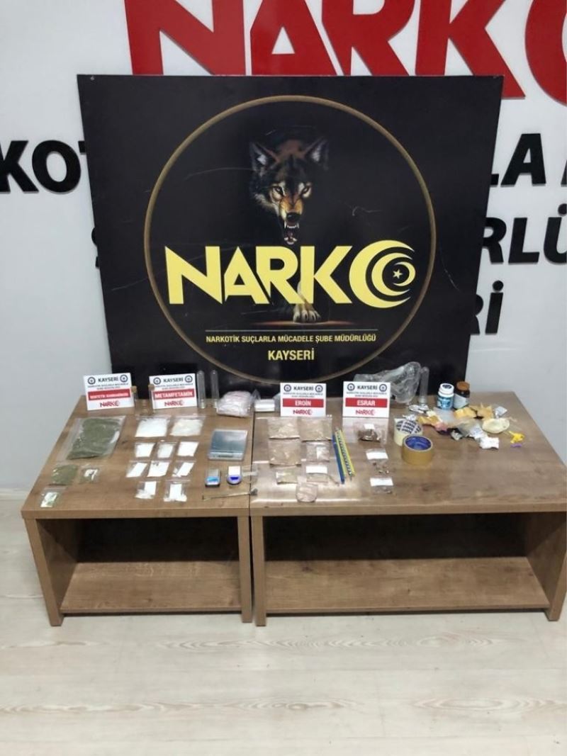 Edinilen bilgiye göre Kayseri İl Emniyet Müdürlüğü Narkotik Suçlarla Şube Müdürlüğü ekipleri tarafından uyuşturucu madde ticareti yapan şahıslara yönelik operasyon düzenledi. Operasyonda yabancı uyruklu 3 kişi gözaltına alınırken, şüpheli şahısların üst, ev ve araç aramalarında 50 gram metamfetamin ,100 gram eroin maddesi, 40 gram bonzai maddesi, 45 gram esrar maddesi ve 3 adet çalışır vaziyette hassas terazi ele geçirildi.