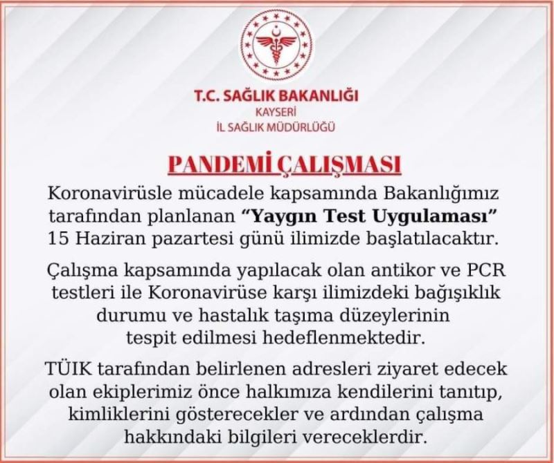 Yapılan açıklamada; Korona virüsle mücadele kapsamında bakanlığımız tarafından planlanan 'Yaygın Test Uygulaması' 15 Haziran Pazartesi günü ilimizde başlatılacaktır. Çalışma kapsamında yapılacak olan antikor, ve PCR testleri ile korona virüse karşı ilimizdeki bağışıklık durumu ve hastalık taşıma düzeylerinin tespit edilmesi hedeflenmektedir. TÜİK tarafından belirlenen adresleri ziyaret edecek olan ekiplerimiz önce halkımıza kendilerini tanıtıp kimliklerini gösterecekler ve ardından çalışma hakkındaki bilgileri vereceklerdir" denildi. (İHA)