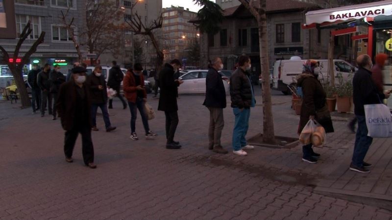 Kısıtlamaya saatler kala vatandaşlar alış veriş sırasında uzun kuyruklar oluşturdu.