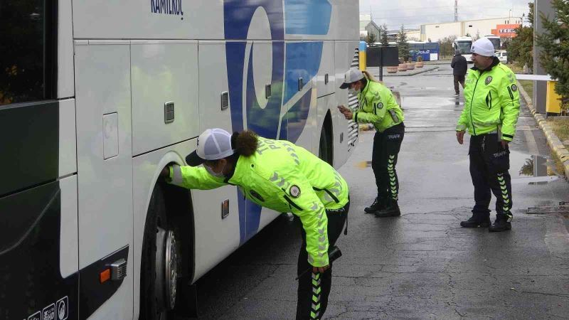 Kayseri’de polis ekipleri tarafından yapılan uygulamalarda, terminalden çıkış yapan yolcu otobüslerinin kışlık lastikleri denetlendi.