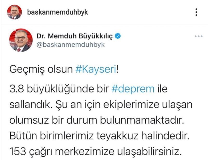 Kayseri’nin Kocasinan ilçesinde meydana gelen 3.8 büyüklüğündeki depremin ardından Büyükşehir Belediye Başkanı Memduh Büyükkılıç; şuana kadar herhangi bir olumsuz durumun bulunmadığını söyledi.