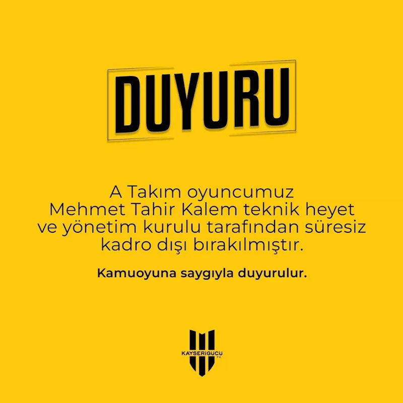 Kayserigücü Futbol Kulübü’nden yapılan açıklamada, “A Takım oyuncumuz Mehmet Tahir Kame teknik heyet ve yönetim kurulu tarafından süresiz kadro dışı bırakılmıştır” denildi.
