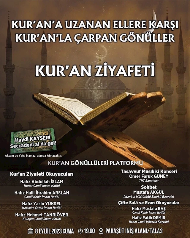 Kur’an Gönüllüleri Platformu, son zamanlarda Kur’an-ı Kerim’e karşı yapılan çirkin saldırılara karşı "Kur’an’a uzanan ellere karşı Kur’an’la çarpan gönüller Kur’an ziyafeti" düzenliyor. 8 Eylül Cuma akşamı Talas’ta bulunan Paraşüt İniş Alanı’nda düzenlenecek olan ziyafete, tüm Kayserililer "Haydi Kayseri seccadeni al gel" sloganı ile davet edildi.