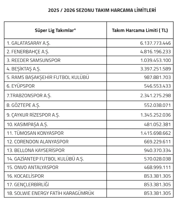 Türkiye Futbol Federasyonu (TFF) Kulüp Lisans Kurulu, 2024-2024 Sezonu Süper Lig takım harcama Limitlerini belirledi. Buna göre, yeni sezon için en çok harcama limiti Galatasaray’a verilirken en az limit ise Antalyaspor’a verildi. Kayserispor, en yüksek harcama limitine sahip 8. takım konumunda yer aldı. En çok harcama limiti alan Galatasaray için 6 milyar 137 milyon 773 bin TL belirlenirken, Kayserispor için ise 940 milyon 370 bin TL harcama limiti belirlendi.