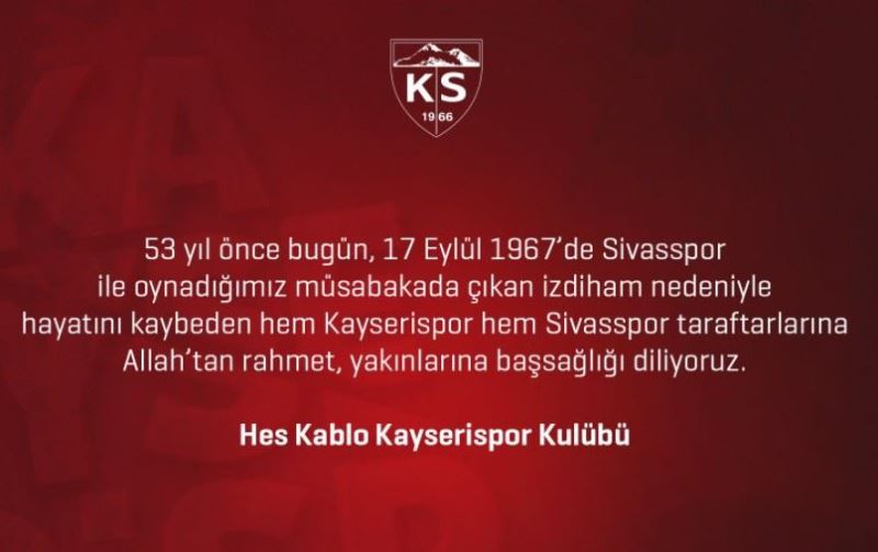 Hes Kablo Kayserispor kulübü, 53 yıl önce Kayserispor-Sivasspor arasında oynanan maçta hayatını kaybeden taraftarlar için başsağlığı mesajı yayınladı.