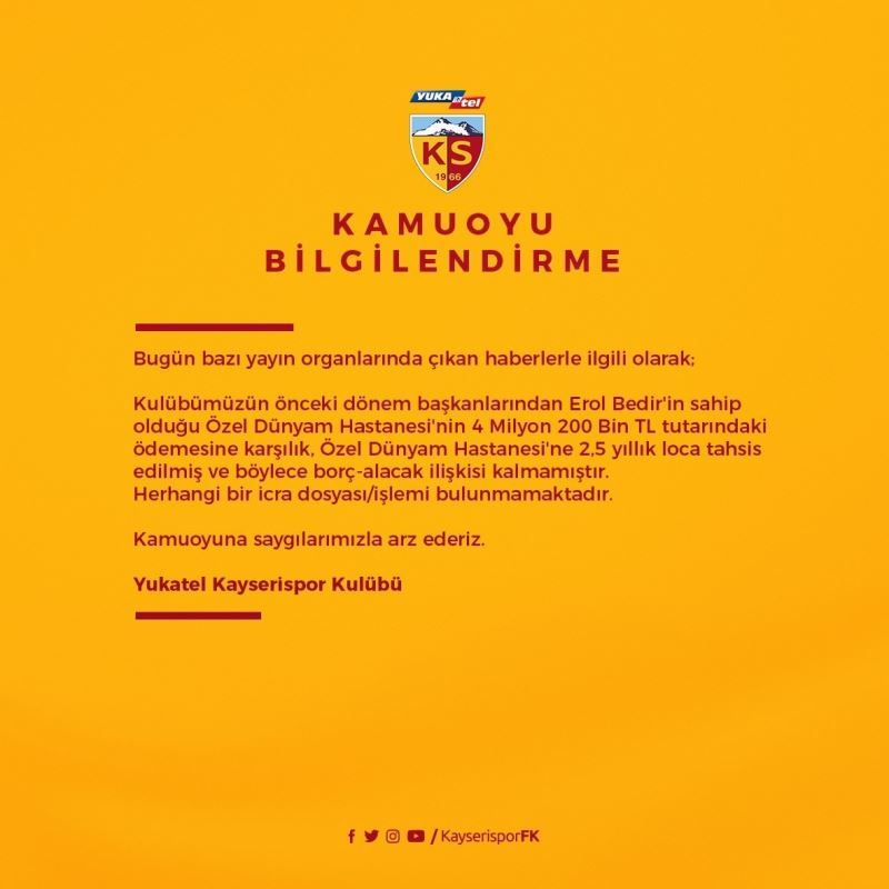 Kayserispor Kulübü, eski başkan Erol Bedir’in sahibi olduğu özel bir hastanenin 4 milyon 200 bin TL’lik alacağına karşılık loca satışı gerçekleştirdi. Sarı kırmızılı kulüpten yapılan açıklamada; "Kulübümüzün önceki dönem başkanlarından Erol Bedir’in sahip olduğu Özel Dünyam Hastanesi’nin 4 Milyon 200 Bin TL tutarındaki ödenmesine karşılık Özel Dünyam Hastanesi’ne 2,5 yıllık loca tahsis edilmiş ve böylece borç-alacak ilişkisi kalmamıştır. Herhangi bir icra dosyası/işlemi bulunmamaktadır. Kamuoyuna saygılarımızla arz ederiz" denildi.