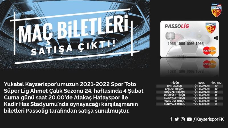 Yukatel Kayserispor ile Hatayspor arasında oynanacak Süper Lig maçının biletleri satışa çıkarıldı. Biletler 10 TL ila 40 TL arasında değişiyor.