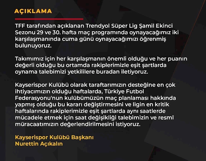 Trendyol Süper Lig’in 29. haftasında sahasında Atakaş Hatayspor ile karşılaşacak olan Kayserispor, bu maçın başlama saatinin değiştirilmesini istedi. Sarı-kırmızılı kulüp, Türkiye Futbol Federasyonu tarafından 28 Mart 2025 Cuma günü oynanmasına ve saat 16.00’da başlamasına karar verilen bu maç için resmi başvuru yaptı. Kayserispor Başkanı Nurettin Açıkalın imzalı yapılan açıklamada, "Takımımız için her karşılaşmanın önemli olduğu ve her puanın değerli olduğu bu ortamda rakiplerimizle eşit şartlarda oynama talebimizi yetkililere buradan iletiyoruz. Kayserispor Kulübü olarak taraftarımızın desteğine en çok ihtiyacımızın olduğu haftalarda, Türkiye Futbol Federasyonu’nun kulübümüzün maç planlaması hakkında yapmış olduğu bu kararı değiştirmesini ve ligin en kritik haftalarında rakiplerimizle eşit şartlarda aynı saatlerde mücadele etmek için saat değişikliği talebimizin ve resmi müracaatımızın değerlendirilmesini istiyoruz" denildi.