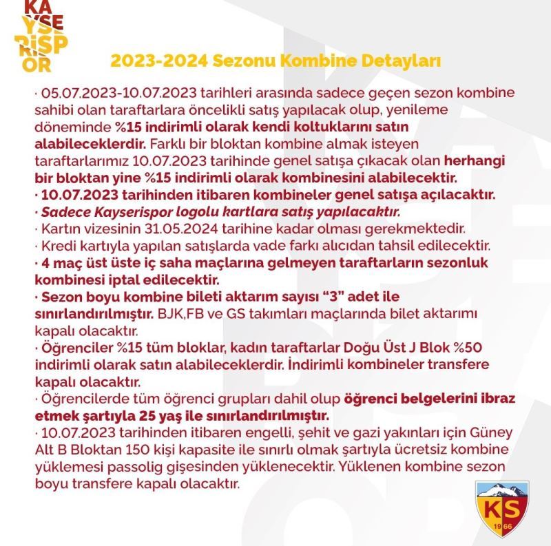 Kayserispor Kulübü, Süper Lig 2023-2024 sezonunda geçerli olmak üzere kombine bilet satışının başlayacağını duyurdu. 5-10 Temmuz arası geçen sezon kombine sahibi olan taraftarlara öncelik satış yapılacak. Sarı kırmızılı kulüpten yapılan açıklamada; "Kayserispor’umuzun Süper Lig 2023-2024 sezonunda geçerli olacak kombine satışları 10 Temmuz Pazartesi günü satışa çıkacaktır” ifadelerine yer verildi.