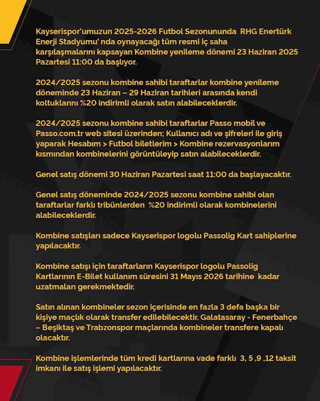Kayserispor Kulübü; Süper Lig 2025-2026 sezonunda geçerli olmak üzere kombine bilet satışının başlayacağını duyurdu. 23-29 Haziran tarihlerinde geçen sezon kombine sahibi olan taraftarlara öncelik satış yapılacak. Yeni sezonda kombine fiyatları 3 bin 500 TL ile 18 bin TL arasında değişiyor. Sarı kırmızılı kulüpten yapılan açıklamada; "Kayserisporumuzun 2025-2026 futbol sezonunda RHG Enertürk Enerji Stadyumu’nda oynayacağı tüm resmi iç saha karşılaşmalarını kapsayan Kombine yenileme dönemi 23 Haziran 2025 Pazartesi 11:00 da başlıyor. 2024/2025 sezonu kombine sahibi taraftarlar kombine yenileme döneminde 23 Haziran - 29 Haziran tarihleri arasında kendi koltuklarını yüzde 20 indirimli olarak satın alabileceklerdir" ifadelerine yer verildi. Kayserispor Kombine fiyatları ise şu şekilde: