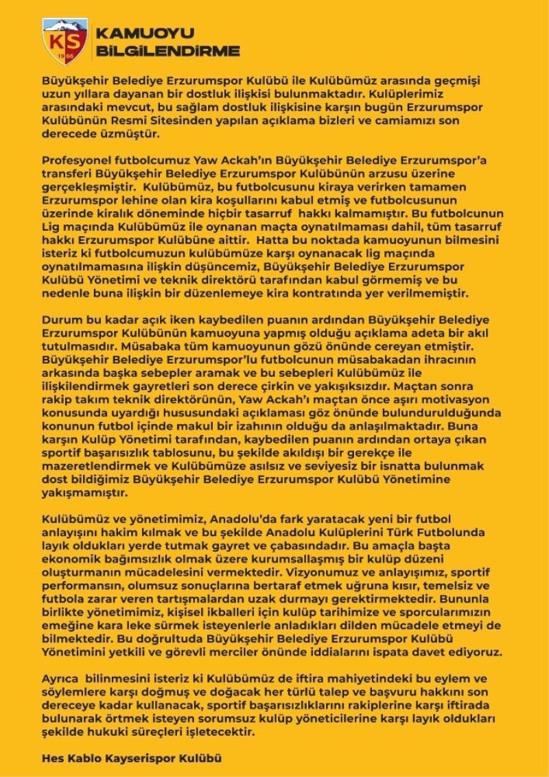 Hes Kablo Kayserispor kulübünden yapılan açıklamada “Büyükşehir Belediye Erzurumspor Kulübü ile Kulübümüz arasında geçmişi uzun yıllara dayanan bir dostluk ilişkisi bulunmaktadır. Kulüplerimiz arasındaki mevcut, bu sağlam dostluk ilişkisine karşın bugün Erzurumspor Kulübünün Resmi Sitesinden yapılan açıklama bizleri ve camiamızı son derecede üzmüştür. Profesyonel futbolcumuz Yaw Ackah’ın Büyükşehir Belediye Erzurumspor’a transferi Büyükşehir Belediye Erzurumspor Kulübünün arzusu üzerine gerçekleşmiştir. Kulübümüz, bu futbolcusunu kiraya verirken tamamen Erzurumspor lehine olan kira koşullarını kabul etmiş ve futbolcusunun üzerinde kiralık döneminde hiçbir tasarruf hakkı kalmamıştır. Bu futbolcunun Lig maçında Kulübümüz ile oynanan maçta oynatılmaması dahil, tüm tasarruf hakkı Erzurumspor Kulübüne aittir. Hatta bu noktada kamuoyunun bilmesini isteriz ki futbolcumuzun kulübümüze karşı oynanacak lig maçında oynatılmamasına ilişkin düşüncemiz, Büyükşehir Belediye Erzurumspor Kulübü Yönetimi ve teknik direktörü tarafından kabul görmemiş ve bu nedenle buna ilişkin bir düzenlemeye kira kontratında yer verilmemiştir” denildi.