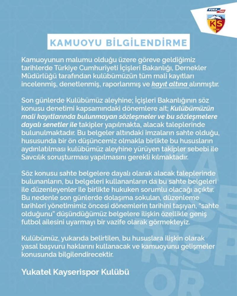 Yukatel Kayserispor Kulübü, yazılı bir açıklama yaparak bazı kişilerin sahte senet ile alacak tahsiline kalkıştığı yönündeki düşünceden ötürü yasal yollara başvurdu.