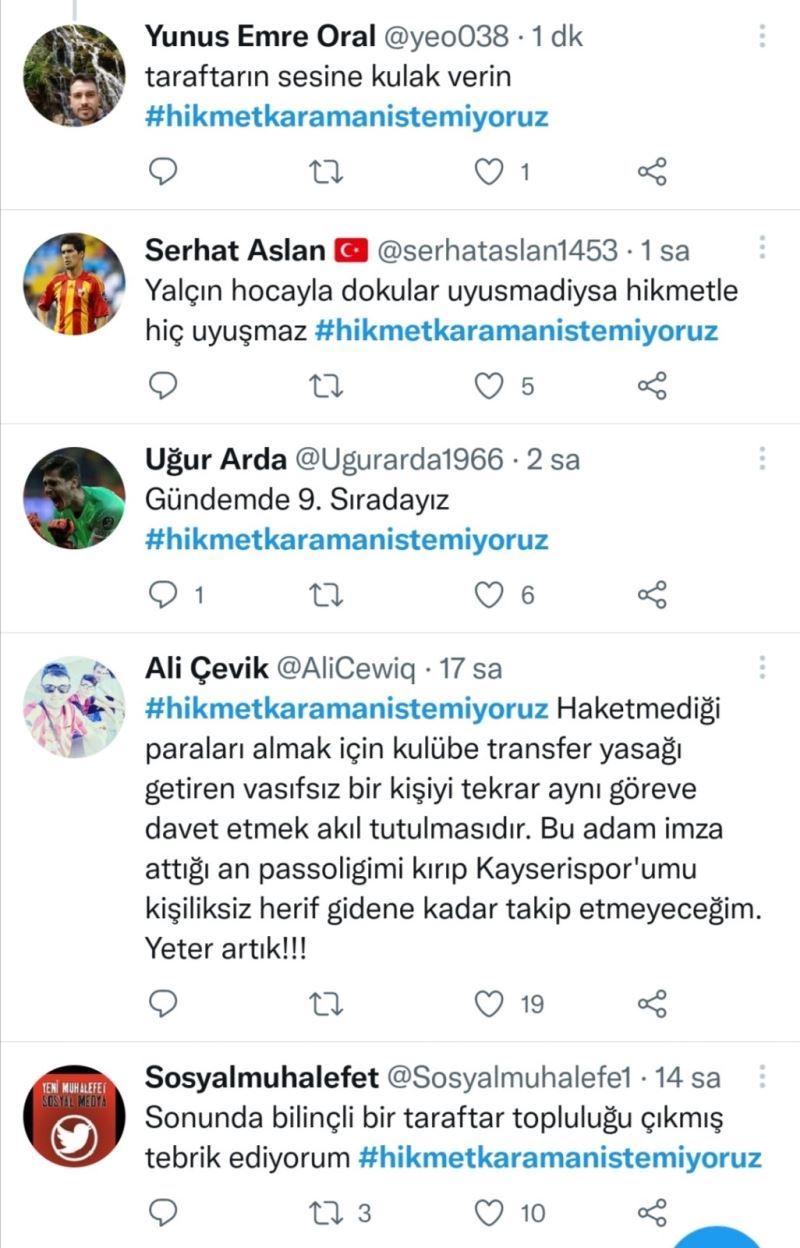 Ligin ilk haftasında deplasmanda Altay’a 3-0 yenilen Kayserispor’da, Teknik Direktör Yalçın Koşukavak ile yollar ayrılmıştı. Ardından teknik direktör arayışına giren kulüpte, Hikmet Karaman ismi ön plana çıktı. Bunun üzerine sosyal medya platformu Twitter’da ’hikmetkaramanistemiyoruz’ hashtag’i açan taraftarlar, kısa süre içerisinde Türkiye gündemine girdi.