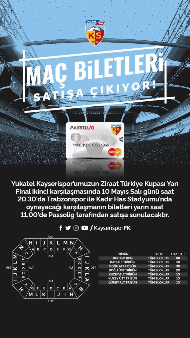 Ziraat Türkiye Kupası yarı final rövanş maçında Kayserispor ile Trabzonspor’un karşılaşacağı maçın bilet fiyatları belli oldu. 10 Mayıs Salı günü Kadir Has Stadı’nda oynanacak maçın bilet fiyatları şu şekilde: