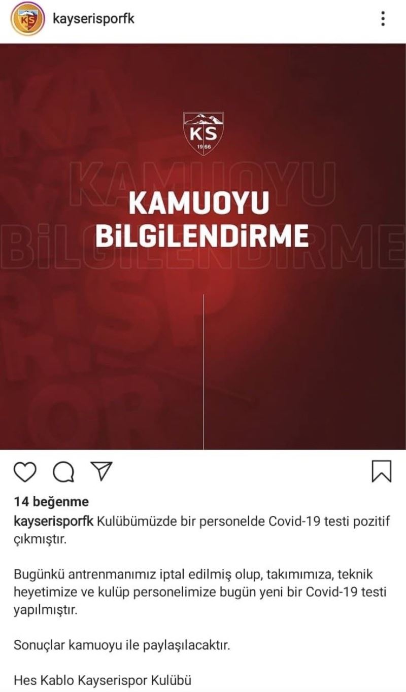 Hes Kablo Kayserispor’un sosyal medya hesabından yapılan bir açıklamayla, kulüp personellerinden birinin korona virüs testinin pozitif çıktığı ve bugün yapılması gereken antrenmanın iptal edildiği belirtildi.