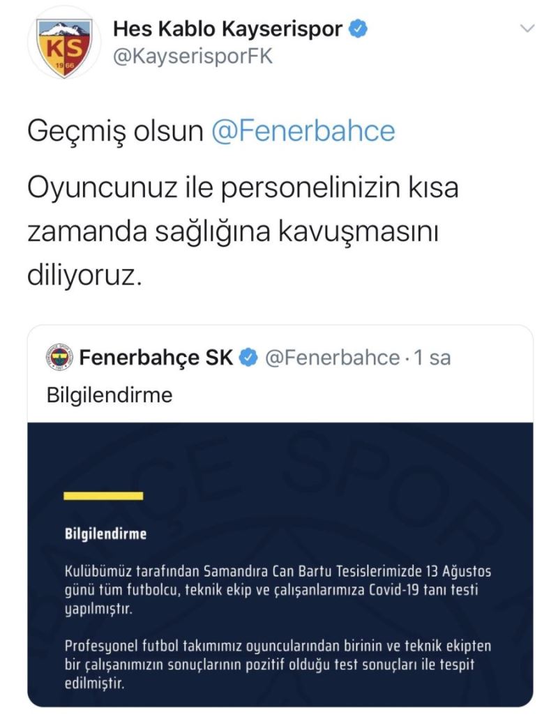 Hes Kablo Kayserispor Kulübü sosyal medya hesabından paylaştığı geçmiş olsun mesajında, " Geçmiş olsun Fenerbahçe. Oyuncunuz ile personelinizin kısa zamanda sağlığına kavuşmasını diliyoruz" denildi. (İHA)