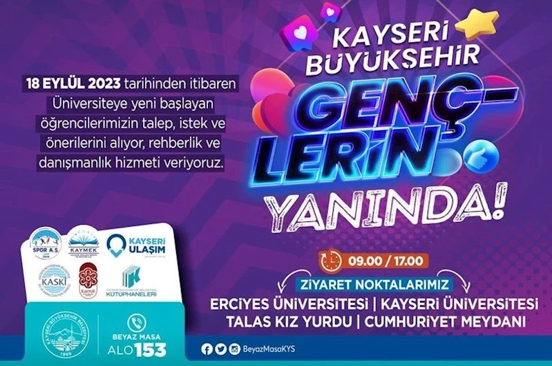 Kayseri Büyükşehir Belediyesi, ’Alo 153 İletişim Merkezi’ ve ’Beyaz Masa’ birimleri ile Erciyes Üniversitesi, Kayseri Üniversitesi, Talas Kız Yurdu ve Cumhuriyet Meydanı’nda üniversiteye yeni başlayan ve Kayseri’ye ilk defa gelen öğrencilere rehberlik ve danışmanlık hizmeti verecek. Başlatılan hizmet çerçevesinde üniversiteye yeni başlayan öğrencilere kentin tanıtımı ve imkânları ile ilgili rehberlik ve danışmanlık hizmeti verilirken, öğrencilerin talep ve önerileri de kayıt altına alınarak anında Büyükşehir’in ilgili birimlerine iletilecek. 18 Eylül itibariyle başlayan ve dört ayrı noktada verilecek olan rehberlik ve danışmanlık hizmeti saat 09.00’dan 17.00’ye kadar devam edecek.