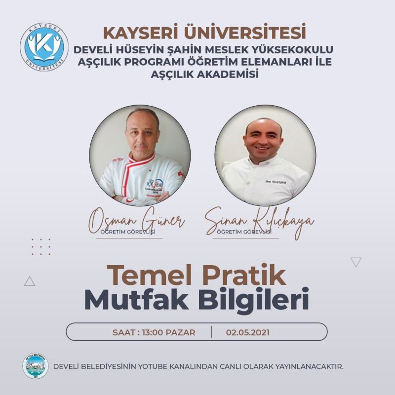 Kayseri Üniversitesi Develi Hüseyin Şahin MYO Aşçılık Programı öğretim elemanlarının katkıları ile oluşturulan "Aşçılık Akademisi" Develi Belediyesi’nin youtube kanalı üzerinden Develili ev hanımlarına ‘Yemek Pişirme ile Mutfağın Püf Noktaları’ ve ‘Yerel-Yöresel Yemekler’ konularında eğitim verecek.