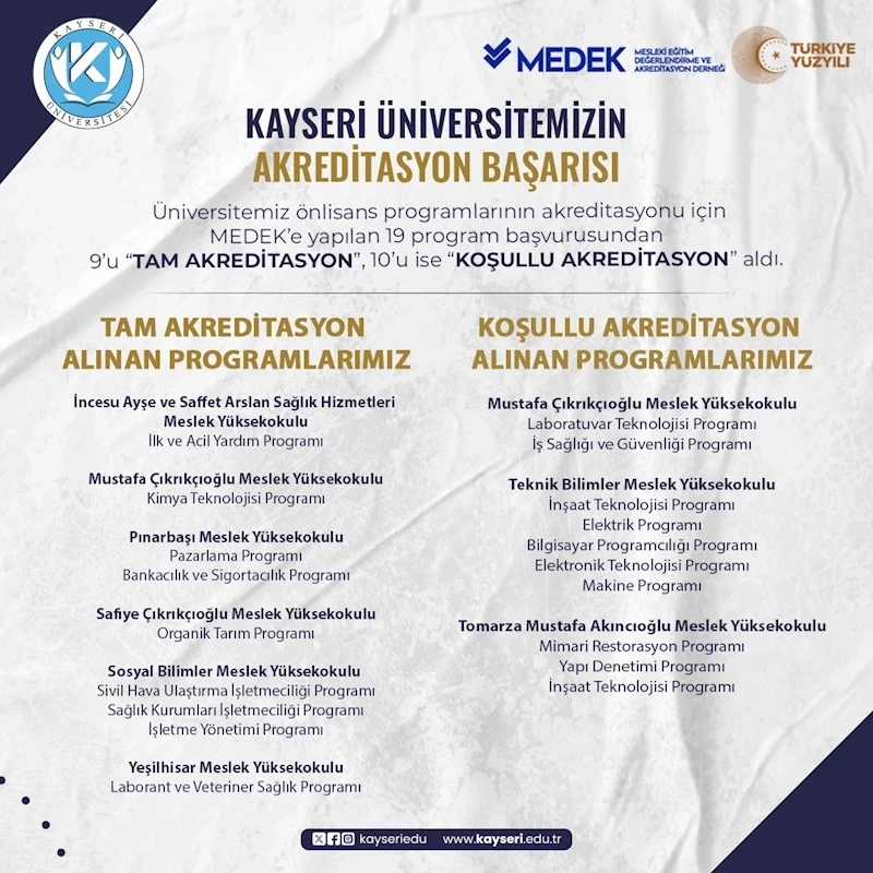 Kayseri Üniversitesi Tomarza Mustafa Akıncıoğlu Meslek Yüksekokulu’nun Mimari Restorasyon, Yapı Denetimi ve İnşaat Teknolojisi Programları; Teknik Bilimler Meslek Yüksekokulu’nun İnşaat Teknolojisi, Elektrik, Bilgisayar Programcılığı, Elektronik Teknolojisi ve Makine Programları; Mustafa Çıkrıkçıoğlu Meslek Yüksekokulu’nun Laboratuvar Teknolojisi ile İş Sağlığı ve Güvenliği Programları ise “Koşullu Akreditasyon” almaya hak kazandı.