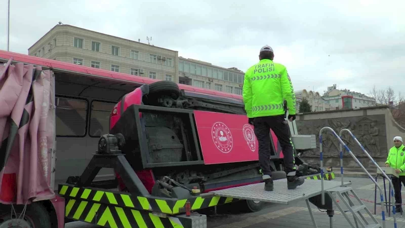 Cumhuriyet Meydanı’nda yapılan uygulamada, ekipler önce trafikte emniyet kemerini takmayan sürücüleri tespit ederek çevirme noktasına aldı. Daha sonra sürücüleri kurulan mobil simülasyon aracına alan ekipler, kemer takılmaması halinde kaza anında olacakları göstermek için sürücüleri araca bindirdi.