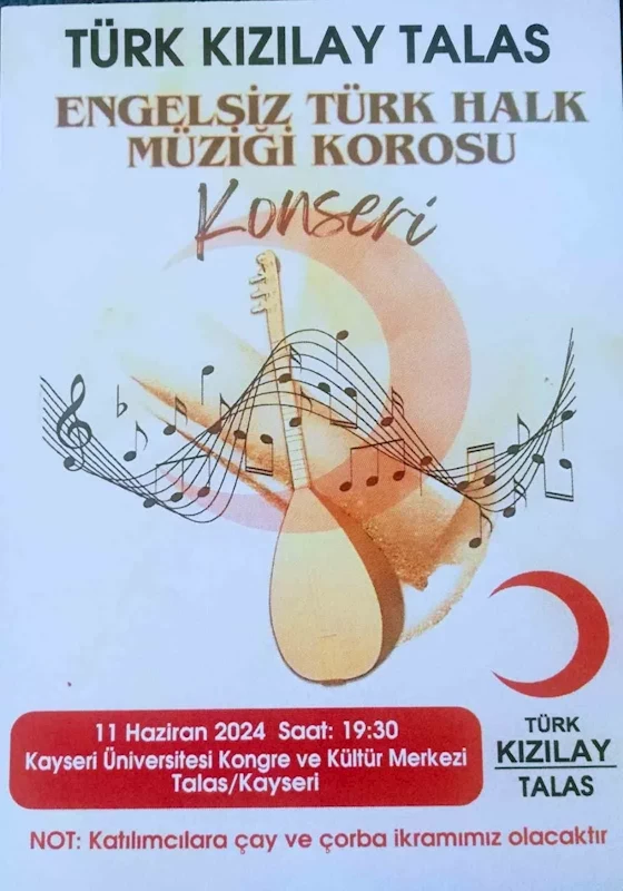 Türk Kızılay Talas Şubesi tarafından düzenlenecek olan Engelsiz Türk Halk Müziği Korosu konseri, 11 Haziran Salı günü Kayseri Üniversitesi (KAYÜ) Kongre ve Kültür merkezinde saat 19.30’da başlayacak.