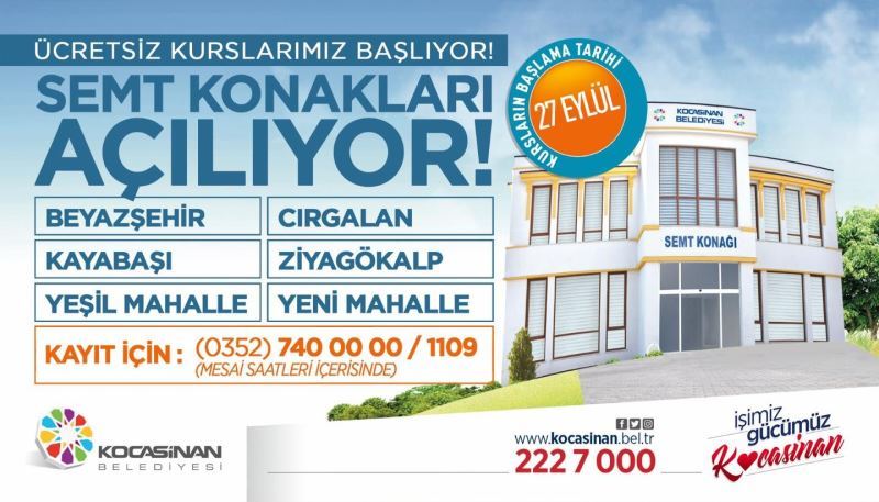 Öte yandan 20 Eylül Pazartesi günü başlayacak olan Kocasinan Akademi Erciyesevler tesisi için: 0(352) 740 0000 / 1101, Yakut tesisi için: 0(352) 740 0000 /1110, Mimarsinan tesisi için : 0(352) 740 0000 /1106, ayrıca 27 Eylül Pazartesi Günü başlayacak olan Semt konakları ve Çocuk Kulübü kurslarından faydalanmak isteyenler için: 0(352) 740 0000/1109’ nolu telefon numaralarından ayrıntılı bilgi alınabileceği kaydedildi.