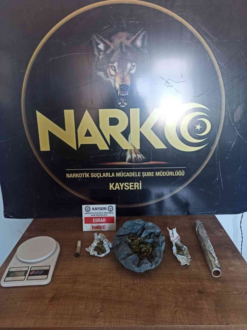 Edinilen bilgiye göre, Kayseri İl Emniyet Müdürlüğü Narkotik Suçlarla Mücadele Şube Müdürlüğü ekipleri tarafından yapılan çalışmalarda H.U.’nun uyuşturucu madde ticareti yaptığı bilgisi üzerine harekete geçildi. Şahsın ikametini tespit eden ekipler, koçbaşı ile kapıyı kırarak evde arama yaptı. Evde bulunan H.U. gözaltına alına alınırken, yapılan aramalarda ise, 40 gram esrar, 1 adet uyuşturucu paketlemek için rulo folyo ve 1 adet hassas terazi ele geçirildi.