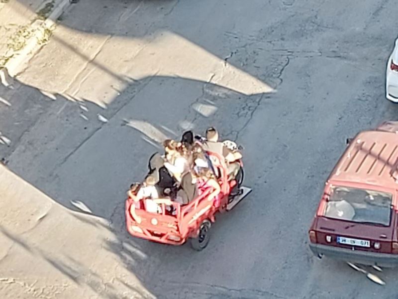 Kayseri'nin Kocasinan ilçesinde 7'si çocuk 13 kişinin triportör üzerindeki sosyal mesafesiz gezisi, korona virüse davetiye çıkardı.