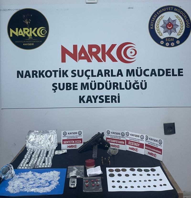 Kayseri İl Emniyet Müdürlüğü Narkotik Suçlarla Şube Müdürlüğü ekipleri bir şahsın otomobil ile uyuşturucu ticareti yaptığı bilgisi edindi. İhbarın üzerine harekete geçen ekipler otomobilin yerini tespit etti. Kovalamaca sonucu yakalanan otomobilden bir miktar uyuşturucu, 137 adet sentetik uyuşturucu, 1 adet hassas terazi, 6 adet uyuşturucu hap, 1 adet ruhsatsız tabanca, 7 adet fişek ve 35 adet tarihi sikke bulundu.