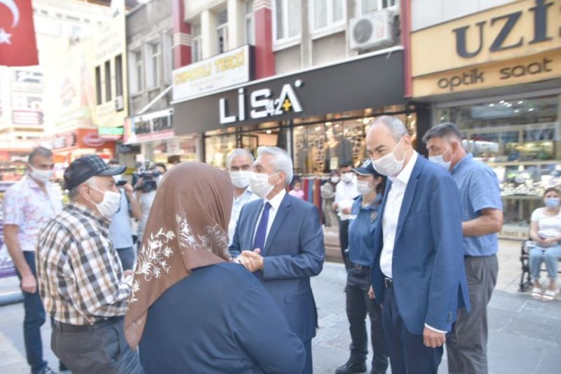 Korona virüs denetimleri kapsamında kent meydanında bulunan esnaf ve vatandaşları ziyaret eden Vali Yardımcısı Ali Uslanmaz ile KTO Başkanı Ömer Gülsoy, maske dağıtarak tedbirlere uyulması konusunda önerilerde bulundu. Heyet ayrıca kurallara uyan vatandaşlara da teşekkür etti. Burada açıklamalarda bulunan Başkan Gülsoy; "Çarşımızda maske, sosyal mesafeyi korumak için insanlarımızı ziyaret edip ikazlarda bulunmaya çalışıyoruz. Sağ olsunlar çarşıdaki esnafımız olsun, halkımız olsun herkes kurallara uyuyor. Kurallara uyanları gördükçe teşekkür ediyoruz. Covid 19’dan kurtulabilmemiz için bu tedbirleri almamız mecburi. Sevdiklerimiz, ülkemiz için mutlaka bu tedbirleri almamız gerekiyor. Tedbir almazsak bu beladan kurtulmamız çok zor olur. Sosyal mesafeli hayat diyoruz" dedi.
