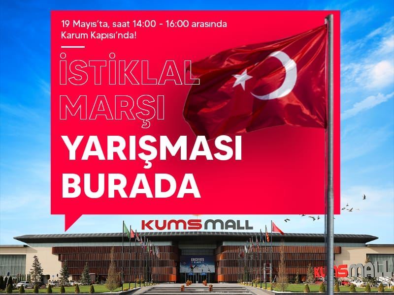 Kumsmall AVM 19 Mayıs Atatürk'ü Anma, Gençlik ve Spor Bayramı dolayısıyla Karum kapıda ziyaretçilerinin katılımıyla "İstiklal Marşı Güzel Okuma Yarışması" düzenleyecek, ziyaretçilerin jüri olarak yer alacağı etkinlikte çocuklara ücretsiz oyun kartı dağıtılacak. 19 Mayıs saat 14:00 - 16:00 arasında düzenlenecek etkinlikte, yarışmaya katılmak isteyenler Kumsmall AVM içerisinde oluşturulan başvuru noktasından kayıt yaptırabilecek.