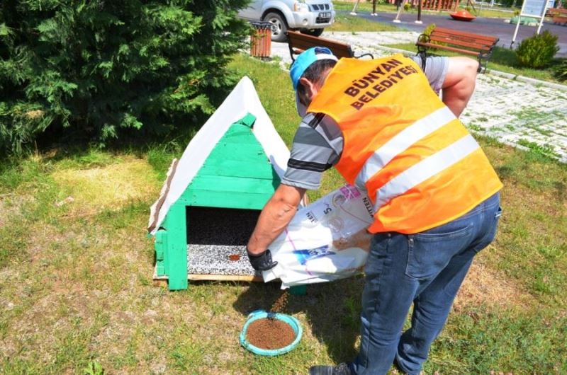 Kayseri'nin Bünyan Belediyesi ilçe sınırları içerisinde aldığı koronavirüs tedbirleri kapsamında sokak hayvanlarını unutmuyor.