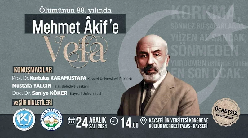 İstiklal Marşı şairi merhum Mehmet Akif Ersoy, vefatının 88. yılında Talas Belediyesi ve Kayseri Üniversitesi (KAYÜ) işbirliğiyle düzenlenecek programda anılacak.