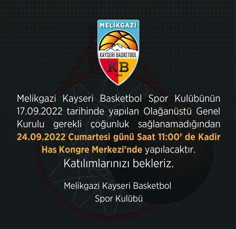 Melikgazi Kayseri Basketbol Kulübünden yapılan açıklamada; “Melikgazi Kayseri Basketbol Spor Kulübü’nün 17.09.2022 tarihinde yapılan Olağanüstü Genel Kurulu gerekli çoğunluk sağlanamadığından 24.09.2022 Cumartesi günü saat 11.00’de Kadir Has Kongre Merkezi’nde yapılacaktır. Üyelerimizin katılımlarını bekleriz” ifadeleri kullanıldı.