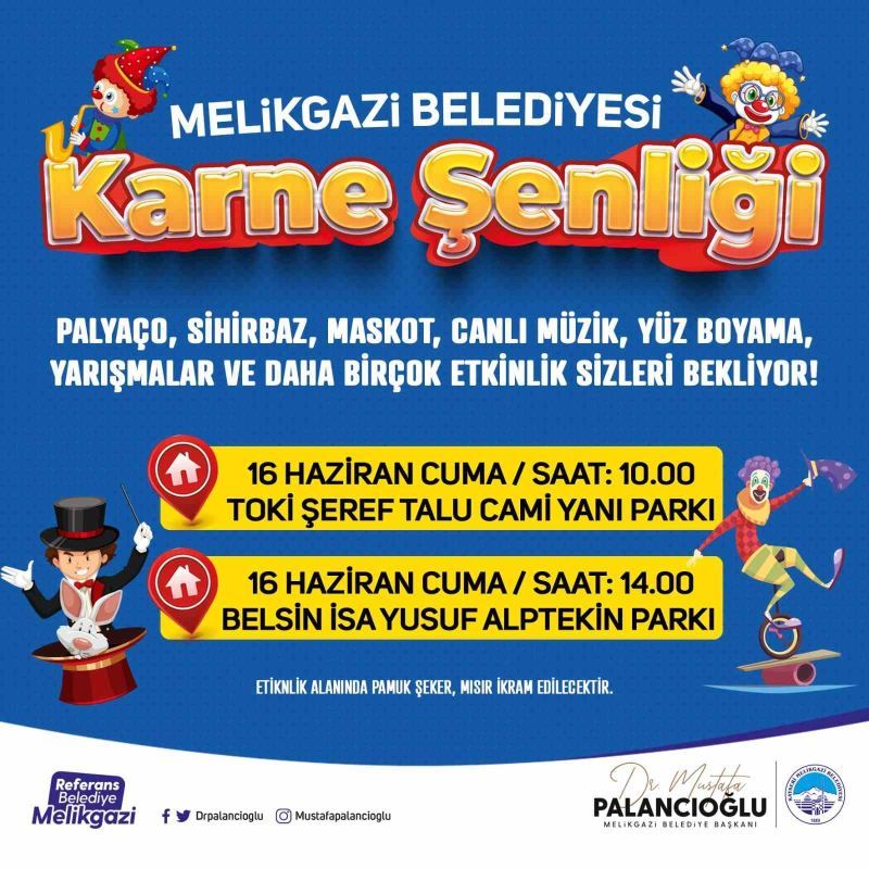 Yorucu bir yıldan sonra çocukların güzel bir karne şenliği ile gönüllerince eğleneceklerini söyleyen Melikgazi Belediye Başkanı Dr. Mustafa Palancıoğlu, "2022- 2023 eğitim-öğretim dönemi boyunca hep yanında ve destekçisi olduğumuz çocuklarımızı tatil başlangıcında da unutmadık. Öğrencilerimiz dolu dolu bir eğitim öğretim dönemini geride bırakıyor. Çocuklarımızın hak ettiği bir organizasyon ile içeriği dopdolu bir programı onların hizmetine sunacağız. Bir yıl boyunca ter döken öğrencilerimiz için 16 Haziran Cuma günü saat 10.00’da TOKİ Demokrasi Mahallesi Şeref Talu Cami yanındaki parkımızda sonrasında Anafartalar Mahallesi İsa Yusuf Alptekin Parkımızda saat 14.00’te düzenleyeceğimiz karne şenliğine tüm öğrencilerimizi bekliyorum. Şenlik kapsamında, çocuklara özel palyaço, sihirbaz, maskot, canlı müzik, çekilişler, yarışmalar gibi birçok etkinlik sunulacak. Karne sevincini doyasıya yaşayacak olan öğrenciler şenliğimizde gönüllerince eğlenecek. Mısır, pamuk şeker ikramımız olacak. Karnesini alan tüm öğrencilerimizi bir yılın yorgunluğunu atmaları ve eğlenceli anlar geçirmeleri şenliğimize bekleriz” dedi.