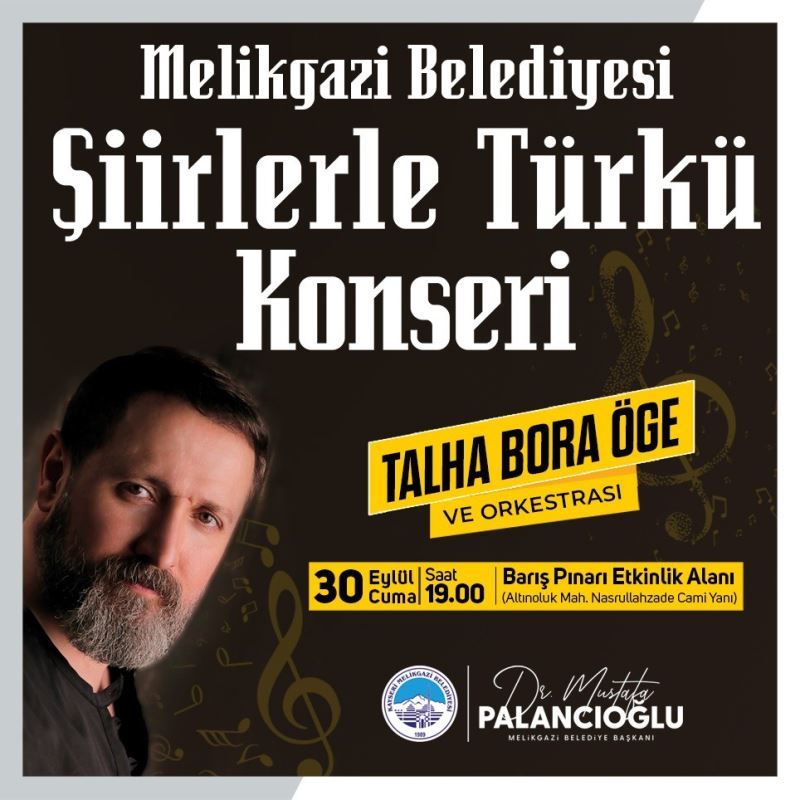 Konser hakkında açıklama yapan Melikgazi Belediye Başkanı Dr. Mustafa Palancıoğlu; "Nam-ı Diğer Gölge’ olarak tanınan Radyo Programcısı ve Şair Talha Bora Öge ve orkestrası 30 Eylül Cuma akşamı tüm hemşehrilerimize şiir ve türkü ziyafeti sunacak. Hemşehrilerimizi böyle güzel kültürel etkinliklerle buluşturmaya devam ediyoruz. Melikgazi Belediyesi olarak teknik çalışmalarımızın yanı sıra sanatsal etkinliklerimizi de ihmal etmiyoruz. Unutulmaz bir akşam için tüm şiir severleri 30 Eylül Cuma günü saat 19.00’da Nasrullahzade Camii yanında bulunan Barış Pınarı Etkinlik Alanı’na bekliyorum" dedi.