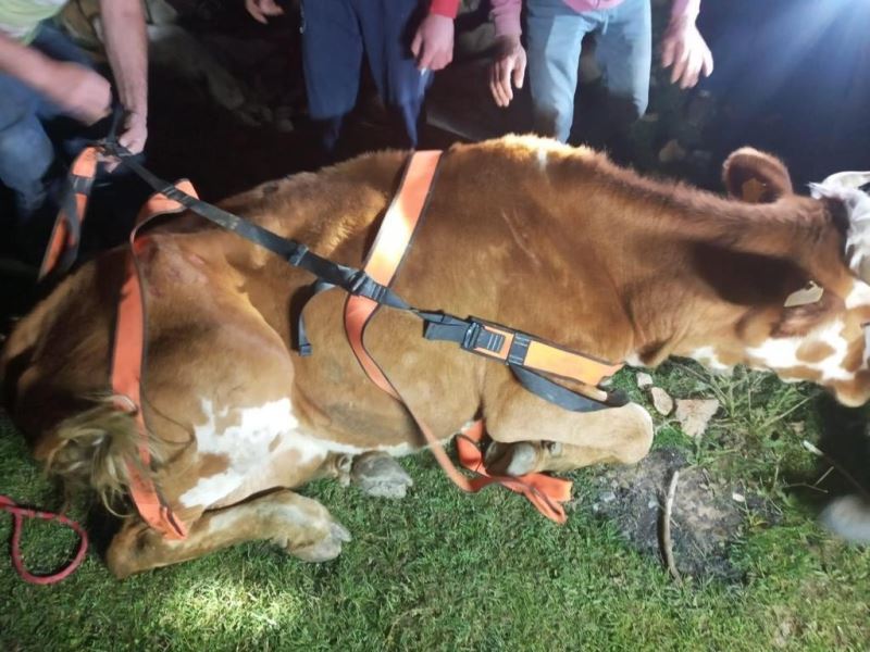 Menfeze sıkışan büyükbaş hayvan 2 saatlik operasyonla kurtarıldı