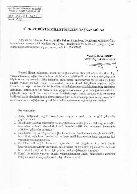 Milliyetçi Hareket Partisi (MHP) Kayseri Milletvekili Baki Ersoy, sosyal medya hesabından yaptığı paylaşımla hareket kısıtlılığı yaşayan vatandaşlar ile ilgili sağlık hizmeti soru önergesi verdiklerini duyurdu.